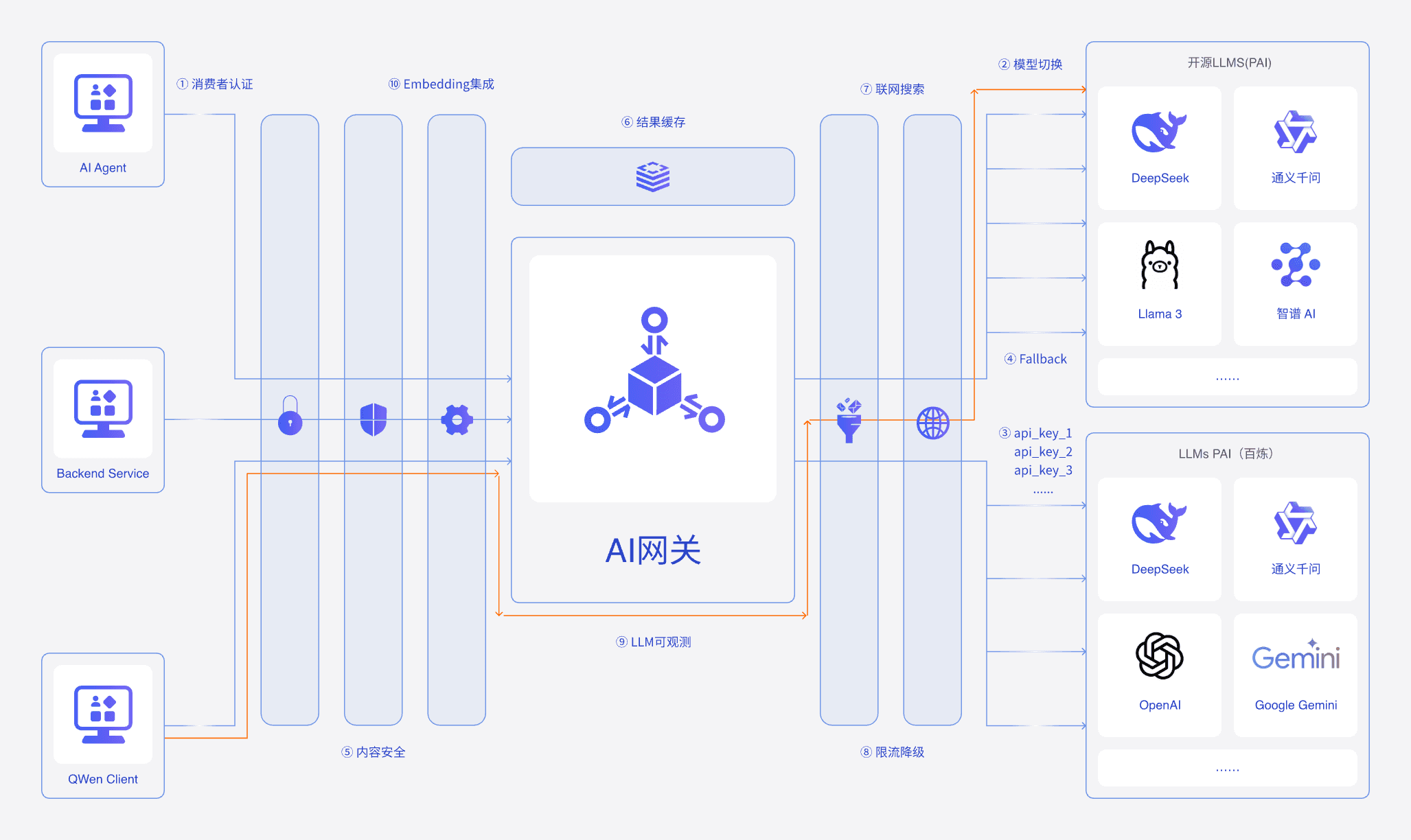 提供大模型内容安全检测,并支持路由配置认证和消费者鉴权,实现对 API 访问的控制、安全性和策略管理。