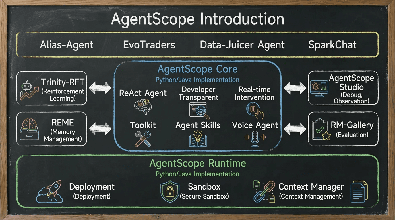 AgentScope is an open-source framework launched by Alibaba that is developer-centric and focuses on intelligent agent development. It is a strategic product at the Agent layer following ModelScope (Magic Community) . Its core goal is to solve the challenges faced by intelligent agents in construction, operation, and management, providing a production-grade solution that covers the full lifecycle of "development, deployment, and optimization," making the development of intelligent agent applications simpler, more stable, and more effective.