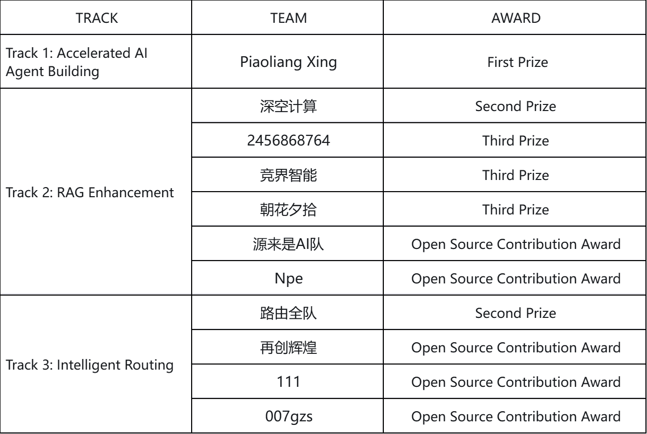 This challenge focuses on three core directions: accelerating AI Agent development, RAG (Retrieval-Augmented Generation) enhancement, and intelligent routing. Each direction aims to address key technical bottlenecks in the current AI gateway field, requiring entries to not only be functionally complete but also to achieve industry-leading levels in technical depth, theoretical basis, and engineering effectiveness. After fierce competition, a total of 11 teams reached the finals to compete for the first, second, third prizes, and the open-source contribution award.