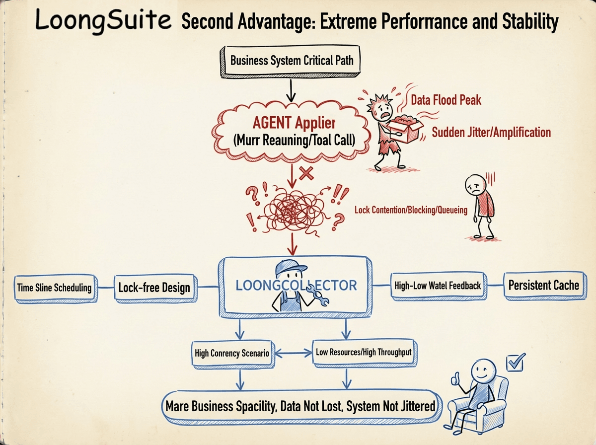 The collection system is located in the critical path of the business system, and any additional jitters introduced will be rapidly amplified. Especially in Agent applications, multiple rounds of inference and frequent tool invocations can lead to sudden data floods. If the collection components experience lock contention, blocking, or unordered accumulation under high concurrency, it is easy to upgrade controllable performance fluctuations to full-link problems.