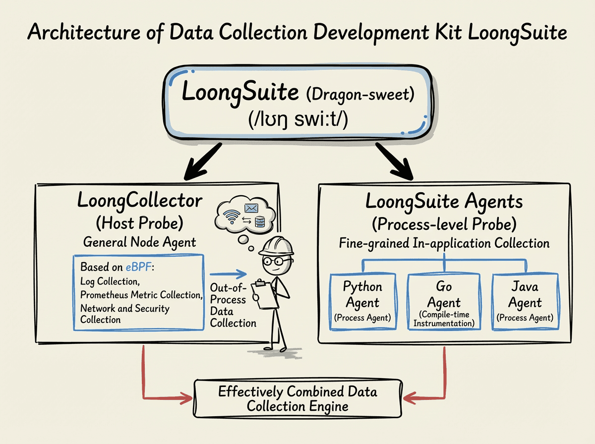 As an open-source data collection development kit, LoongSuite (/lʊŋ swiːt/, transliterated as 龙-sweet) consists of three parts: host probes, process-level probes, and data collection engines, among which: